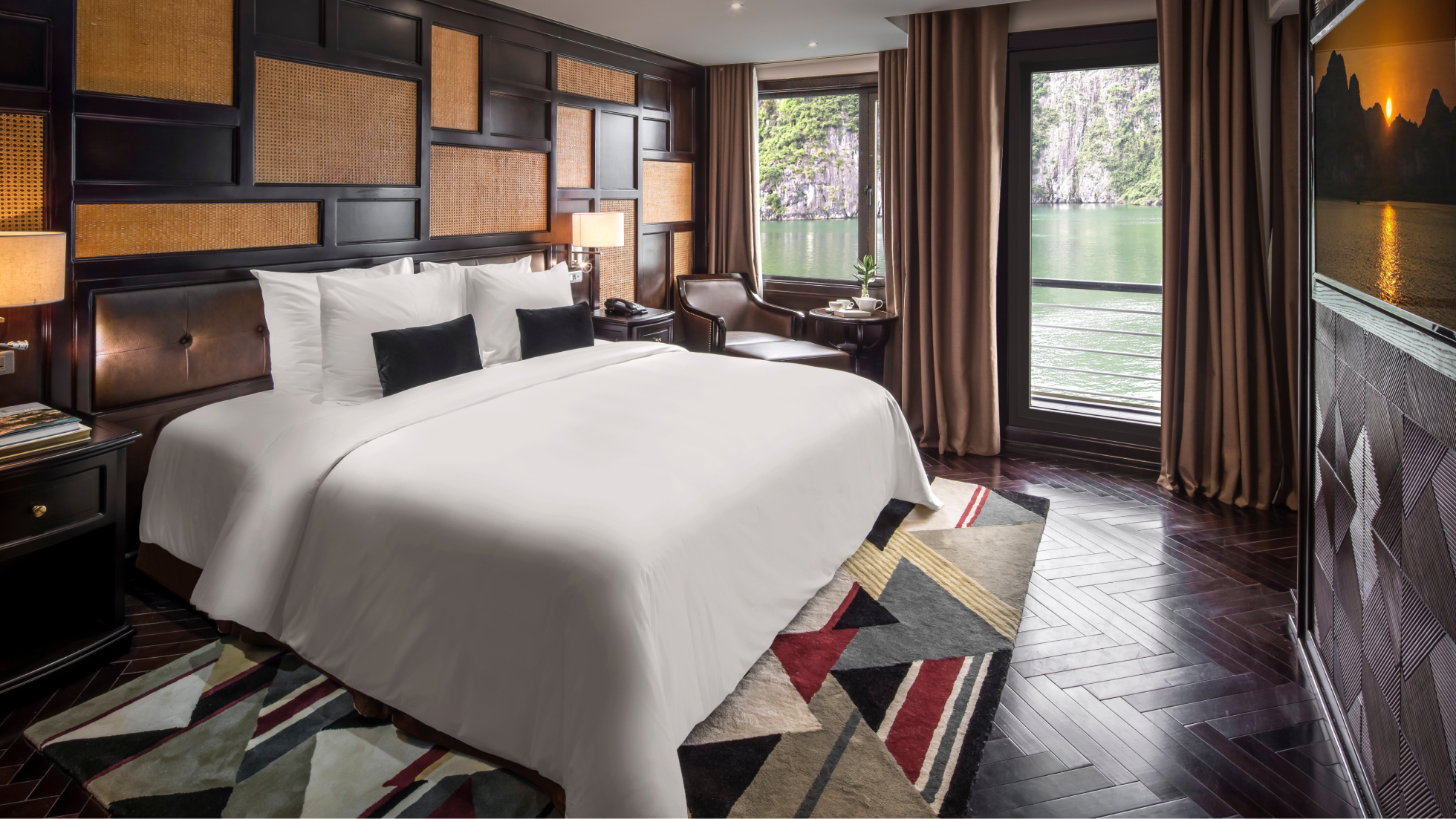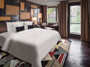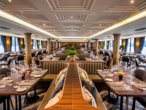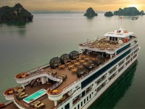 Elegantly designed, the ship features spacious sundecks across two floors with a total area of 324 sqm and 250 sqm, affording 360-degree vistas of Halong Bay and its myriad limestone karsts. Two restaurants, two bars, an entertainment area for live music, and the large open-air Jacuzzi are among the 39-cabin vessel’s top-notch facilities. The five-metre glass bridge jutting from the vessel’s bow inspires compelling photographs
